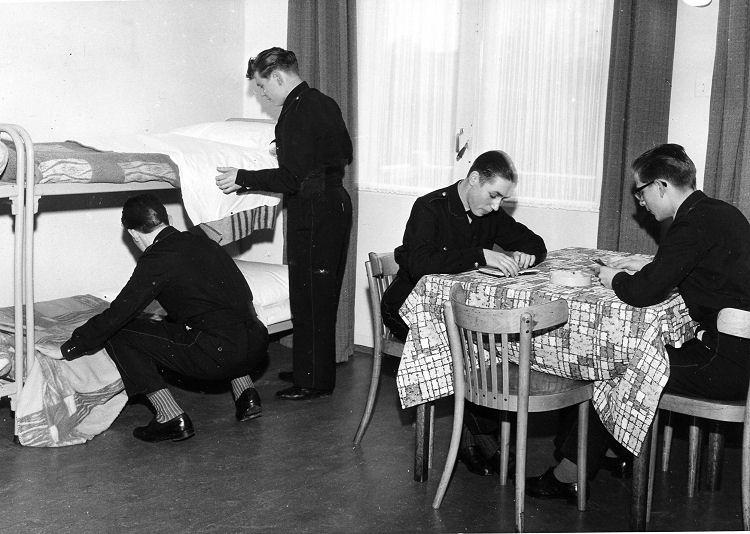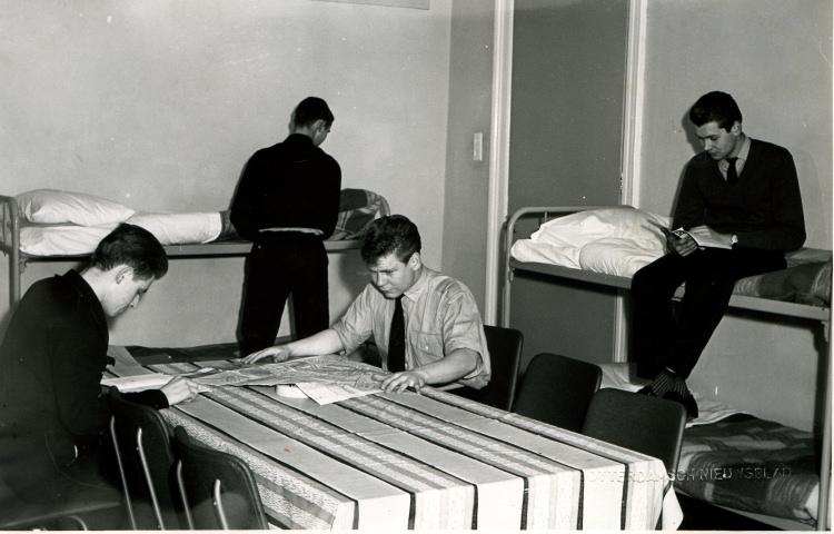 Zo netjes bleef het niet. Rechts met de krant aan tafel Bouke Bijsterbosch en tegenover hem Rinus Stoffels. Rechts op het stapelbed: Eddy van de Brande. En met de rug naar de fotograaf: Piet van der Lijke.