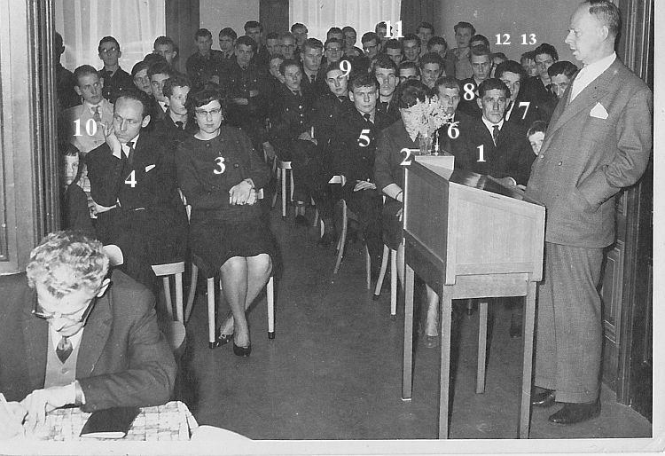 Helemaal links Harry van de Lisdonk. Daarnaast iemand die niet in Het Posthuis woonde? En derde van links Dirk de Vries en naast hem Gerard Kuper. Zesde van links Jan Kuiper (uit Koekange) en naast hem (met bril en opzij kijkend) Jaap Beuving. Naast Jaap een nog onbekende. Zittend aan tafel links Ab Siegrist en rechts Egbert de Vries.
